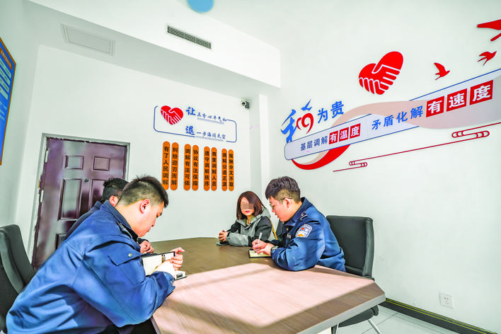 右下图 民警在派出所参与调解一起矛盾纠纷。 本报记者 陈方斌 摄