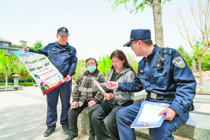 左下图 民警在蒲园进行反诈宣传。