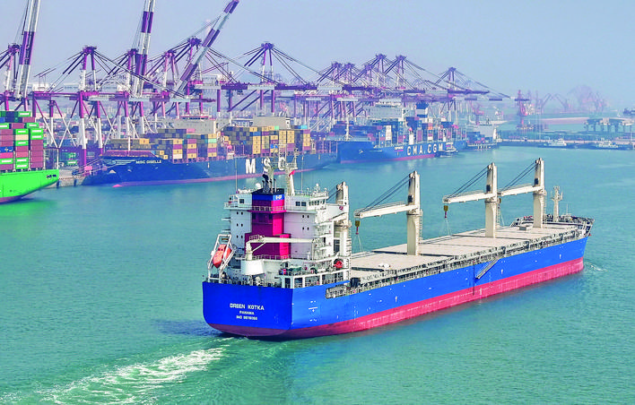 山东港口 一季度吞吐量 集装箱吞吐量 双增长 4月10日,货轮驶出山东港口青岛港前湾集装箱码头(无人机照片)。 据山东省港口集团有限公司统计数据显示,2025年一季度,该集团的货物吞吐量、集装箱吞吐量同比增长分别超过4%、7%,展现出强劲的发展动能和韧性。 新华社记者 李紫恒 摄