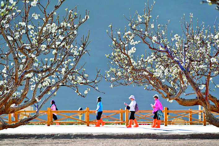 4月12日,游客在甘肃省敦煌市鸣沙山月牙泉景区游览。 新华社发(张晓亮 摄)