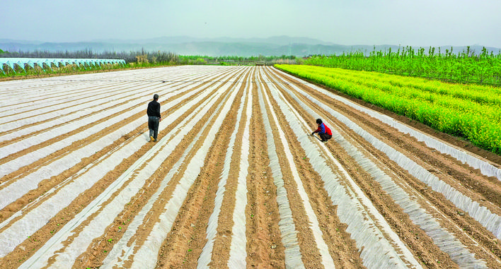 4月14日,夏县裴介镇鲁因村一家农业种植专业合作社的社员,在田间查看土豆等蔬菜发芽情况,以及时开展放风、复土等管护工作,确保土豆等蔬菜安全生长。