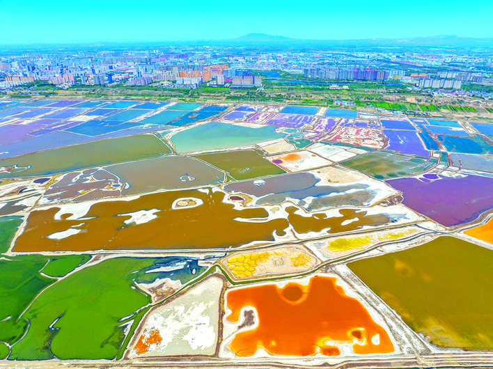 ◀连日来,随着气温回升,运城盐湖迎来一年中最绚烂的时节,湖水在骄阳的映照下幻化出梦幻般的色彩。微风拂过,湖面泛起粼粼波光,不同色带随着水波轻盈舞动,与远处的青山、城市交相辉映,构成一幅“山水城”相融共生的美丽画卷(4月14日摄)。
