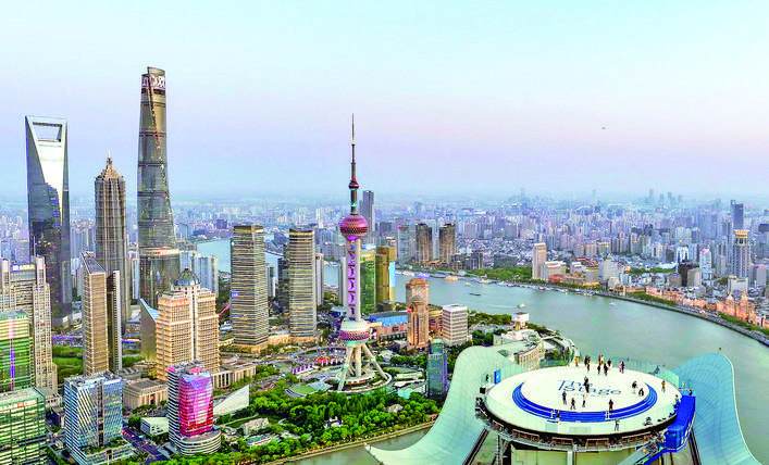 4月14日拍摄的白玉兰观景台(无人机照片)。 4月15日,位于上海白玉兰广场顶层的The Stage白玉兰观景台正式对外开放,市民游客可在320米高度,全景式欣赏充满魅力的城市天际线。新华社记者 刘 颖 摄