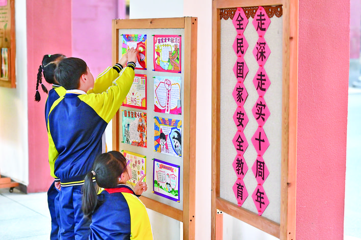 4月15日,在辽宁省海城开发区实验学校,学生在观看全民国家安全教育日主题相关的手抄报。 新华社记者 吴青昊 摄