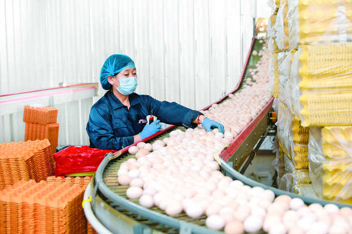 近日,山西维明牧业有限公司工作人员在分拣鸡蛋。该公司是闻喜县最大的蛋鸡养殖企业。一期项目于2023年6月启动,2024年9月竣工投产,总投资达3500万元,目前蛋鸡存栏量达30万只,日产蛋量达1.75万公斤。
