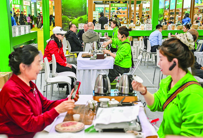 4月18日,参观者在茶博会展位上品茶。 当日,为期4天的第十八届北京国际茶业及茶艺博览会在全国农业展览馆开幕。此次茶博会共设置1300余个标准展位,吸引700余家茶叶茶具企业参展。 新华社记者 陈晔华 摄
