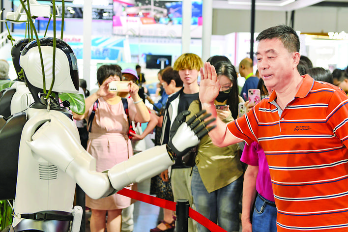 4月17日,观众在消博会中国移动展台与机器人击掌互动。 当日,第五届消博会迎来公众开放日,科技、康养、文化、旅游、体育等领域的消费精品与服务产品与公众见面。 新华社记者 孙笑天 摄