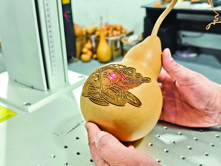 采访时,一个采用阴刻方法、图案脉络粗壮的葫芦作品放在激光雕刻机上,这是在研发适合葫芦的新工艺。这种工艺借鉴于掐丝工艺,但不同于掐丝以铜丝来做凸出器坯表面,而是借助设备阴刻,再将凹进去的地方用矿粉颜料填充,最终经过固化、抛光图案与葫芦表面相平。