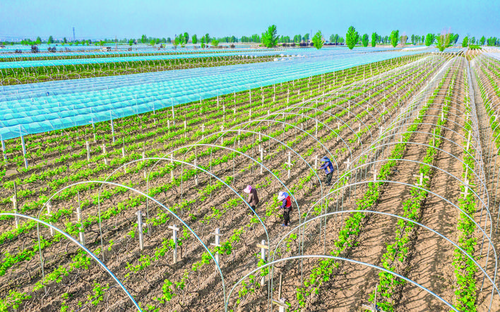 ▲4月21日,盐湖区陶村镇石碑庄村葡萄种植户在管护葡萄树。