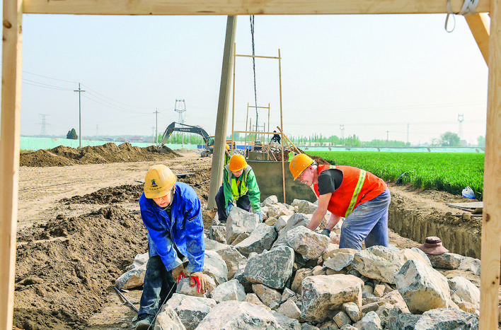 夏县青龙河防洪能力提升项目禹王镇标段现场,工人们在紧张施工(4月19日摄)。