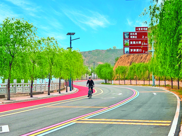 ◀4月22日,在黄河一号旅游公路平陆段,骑行爱好者在骑行。 近年来,平陆县加快沿黄生态廊道建设,加大生态示范创建力度,统筹推进山水林田湖草沙系统治理,黄河山水、黄土风情、田园风光等相映成趣,勾勒出古虞大地优美图景。 特约摄影 郝 健 摄