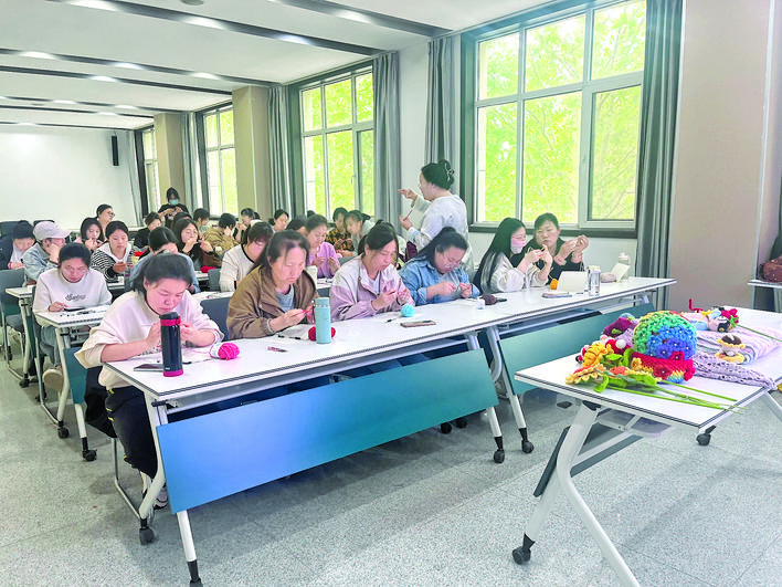 ▲4月21日,“芮城家嫂”家政培训班第9期培训课上,手工钩织老师在给学员讲解如何用钩针打活结。