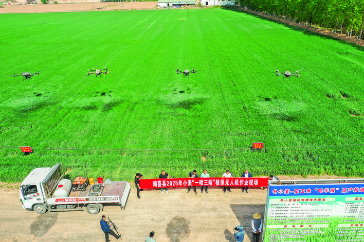 ▲4月26日,闻喜县集中3支队伍121架农用无人机,划片分工开展小麦“一喷三防”。当地采取“政府主导+专家指导+科技赋能”的模式,集中大机群作战,为夏粮稳产丰收系紧科技植保“安全带”。 特约摄影 温徐旺 摄