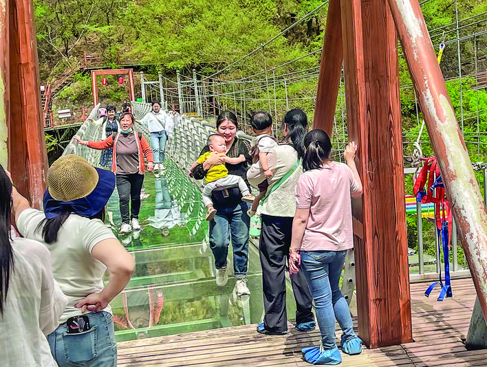 左图:游客从绛北大峡谷景区玻璃吊桥上通过。 本报记者 王新欣 摄