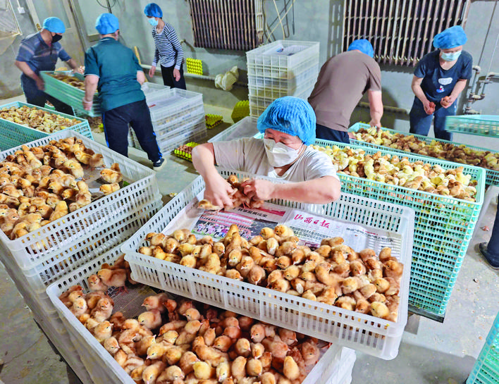 近日,万荣县一养殖公司员工正忙着分拣新孵化的小鸡。