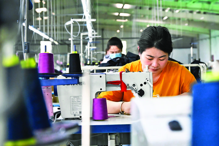 5月6日,垣曲县一服饰加工企业的生产车间内,工人在加工运动外套。