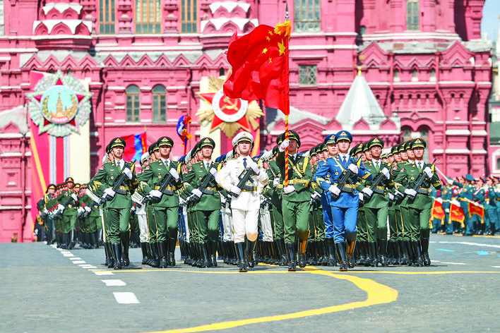 ▶5月9日,在俄罗斯首都莫斯科,中国人民解放军三军仪仗队方队参加纪念苏联伟大卫国战争胜利80周年阅兵式。 新华社记者 白雪骐 摄