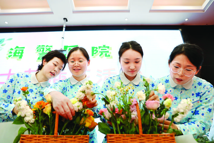 5月9日,在浙江省嘉兴市,海警医院护士参加插花活动。 新华社发(金 鹏 摄)