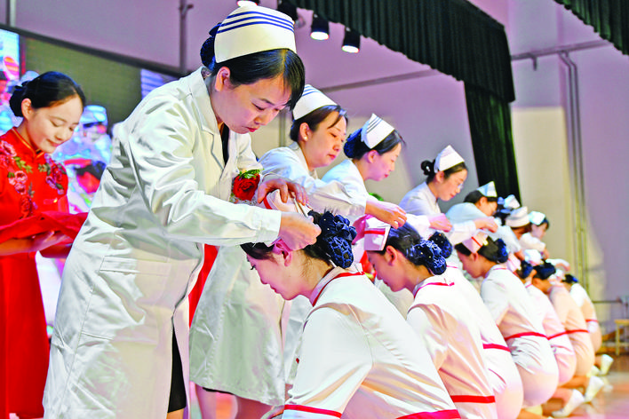 5月8日,在山东省烟台护士学校举行的护士节授帽仪式上,资深护理人员为学生授帽。 新华社发(孙文潭 摄)