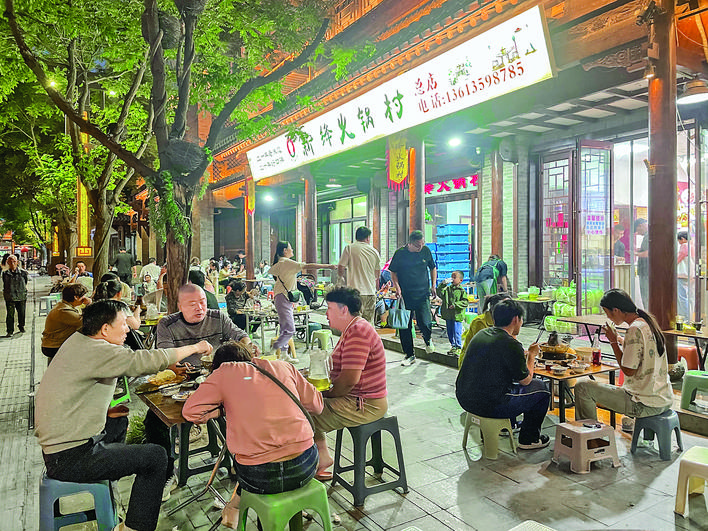 上图 “五一”假期最后一天,游客在盬街一家火锅店品尝河东美食。