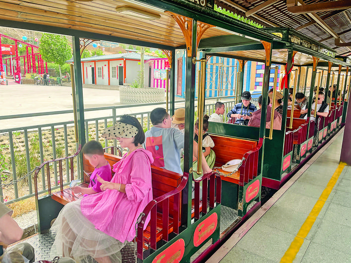 右图 游客在岚山根·运城印象景区乘坐小火车。 本报记者 王新欣 摄