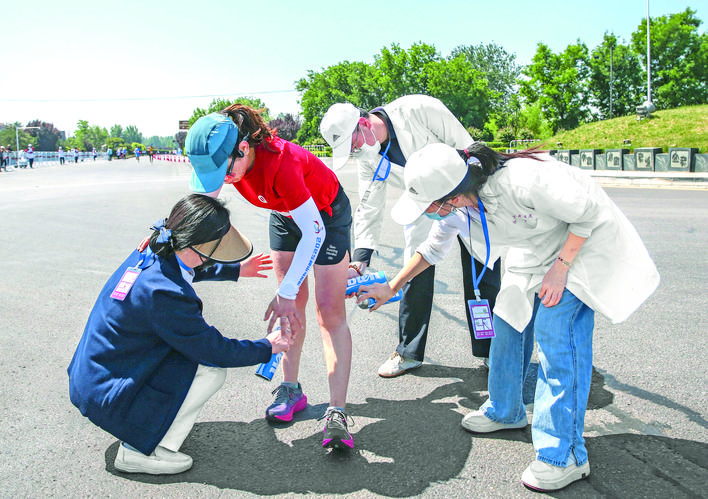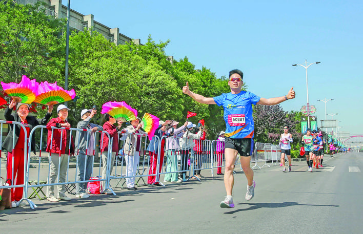赛道内外,热情与汗水共振。“加油!坚持住!”在稷山国家板枣公园赛道,萌娃们挥舞小红旗呐喊,啦啦队用架子鼓点燃气氛。半马女子第三名获得者张蓉蓉在17公里处险些放弃,却因路旁一声声“小姐姐加油”重燃斗志。欢乐跑小选手乔乔则对赛道边的威风锣鼓念念不忘:“鼓声一响,腿就不酸了!”赛道沿途,能量补给站、喷淋降温区、医疗点如“接力棒”般密集分布,志愿者们的击掌和微笑成了选手们的“隐形补给”。