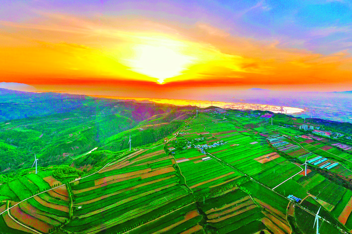 近日,平陆县张店镇风口村广袤的田地间,层层叠叠的梯田与远处的七彩盐湖交相辉映,构成一幅美轮美奂的田园山水画卷。 特约摄影 郝 健 摄
