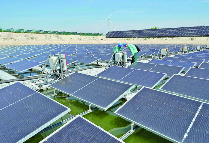 5月15日,国网故城县供电公司的工人在辖区三朗镇居召村一处渔光互补发电场检修并网线路。 近年来,河北省衡水市大力推动清洁能源开发利用,有序推进风电、“渔光互补”“农光互补”和储能电站等新能源项目建设,助力绿色低碳发展。据国网衡水供电公司介绍,目前衡水市风电和光伏发电装机容量达469.57万千瓦,占统调装机容量的77.17%。新华社记者 杨世尧 摄