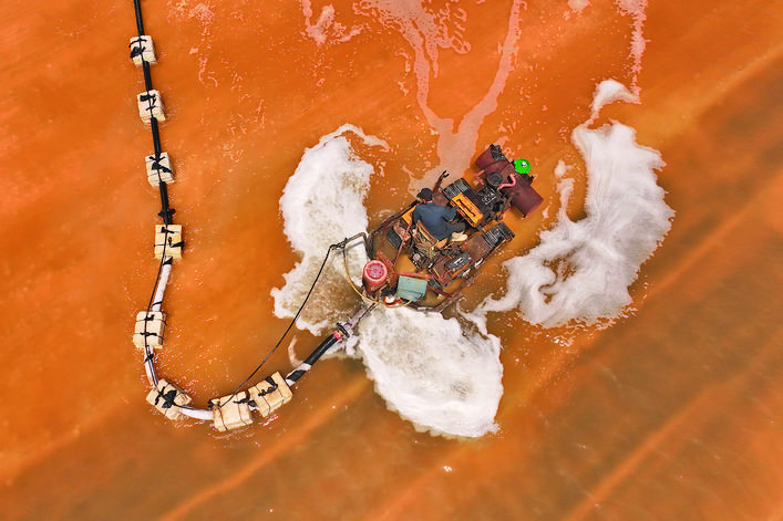 5月18日,河北省唐山市曹妃甸区南堡盐场的35万亩盐田迎来春盐收获期,工人利用晴好天气加紧收获,盐田里到处是繁忙工作景象。 新华社记者 杨世尧 摄