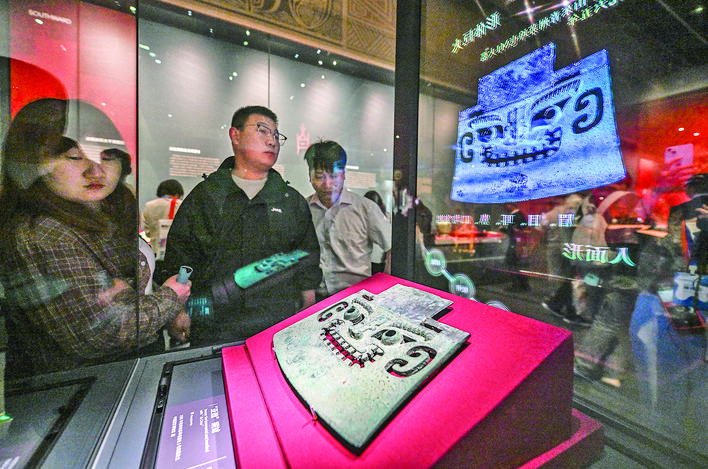 5月18日,观众在北京大运河博物馆观看“中华文明起源系列展:看·见殷商”展览中的“亚醜”铜钺。 新华社记者 陈钟昊 摄