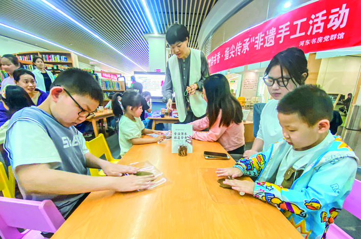 5月17日,中心城区河东书房·党群馆开展“竹韵书香·指尖传承”非遗手工活动,吸引了众多家庭参与。特约摄影 潘志芳 摄