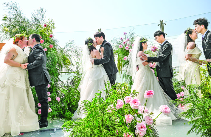▲5月19日,新人在重庆来福士洲际酒店SHUA高空露台举办集体婚礼。 当日,11对来自中外的新人在重庆市渝中区来福士洲际酒店SHUA高空露台举办了“爱·‘渝’见‘中’情”520云端集体婚礼。婚礼上还进行了拓印、非遗剪纸等民俗展示。 新华社记者 陈 诚 摄