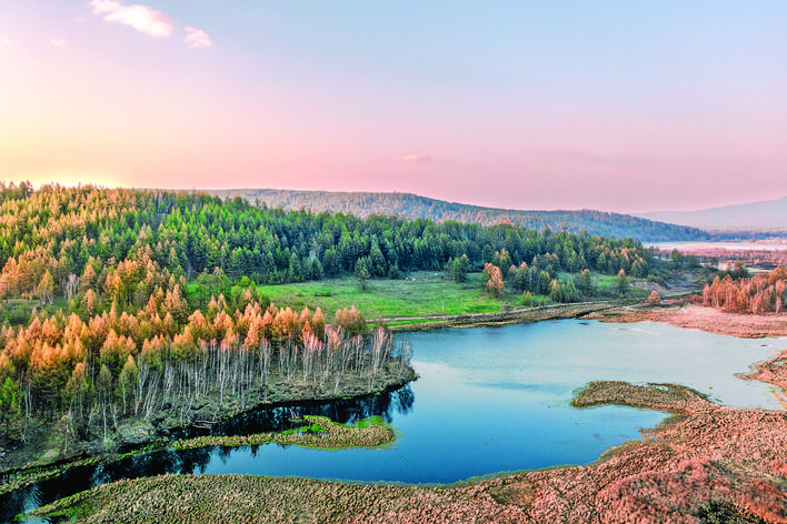 ▼这是5月19日在内蒙古阿尔山国家森林公园拍摄的夕阳下的湖泊风光。新华社记者 马金瑞 摄