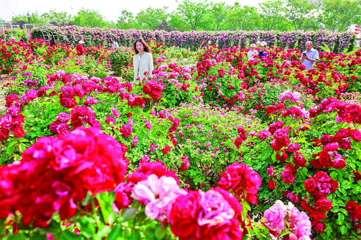 5月19日,游客在山东省枣庄市东湖公园月季园赏花游玩。 新华社发(孙中喆 摄)