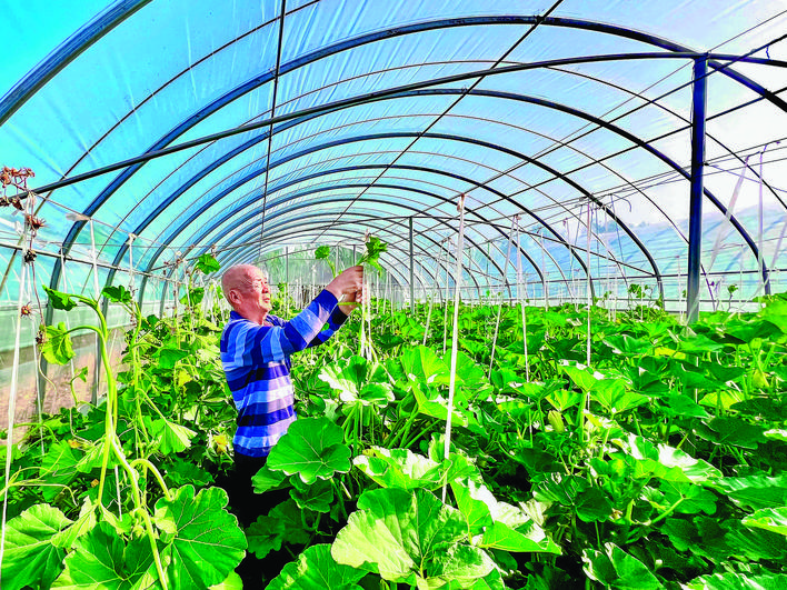 5月20日,平陆县张店镇凌昌农业贝贝南瓜种植基地的设施大棚内,员工在管理秧苗。