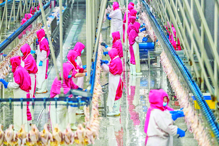 5月21日,永济市一公司的生产车间内,工人们正在进行肉鸡深加工。