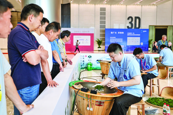 5月21日,观众在2025年浙江省龙井茶炒制技能大赛现场参观。 当日,第七届中国国际茶叶博览会在浙江杭州开幕。本届国际茶叶博览会展出了来自我国十余个茶叶主产区的各类茶叶以及茶饮、茶器,在展会期间还举行了2025年浙江省龙井茶炒制技能大赛。 新华社记者 江 汉 摄