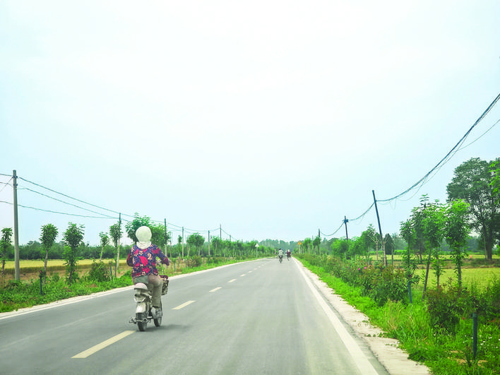 ▶村民在青渠屯村新修建的柏油路上骑行。