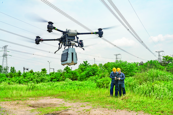 5月22日,在位于绍兴诸暨市的500千伏线路现场,工作人员操作搭载了地线断股带电修补机器人的大疆无人机起飞,对线路进行修复。 近日,一款自主研发的输电线路机载式地线断股带电修补机器人在国网绍兴供电公司正式投入使用。该技术实现了这一缺陷处理的“机器代人”。近年来,巡检机器人、修补机器人、除冰机器人、水下机器人在电网运维中得到应用,显著提升电网运行可靠性。 新华社记者 翁忻旸 摄