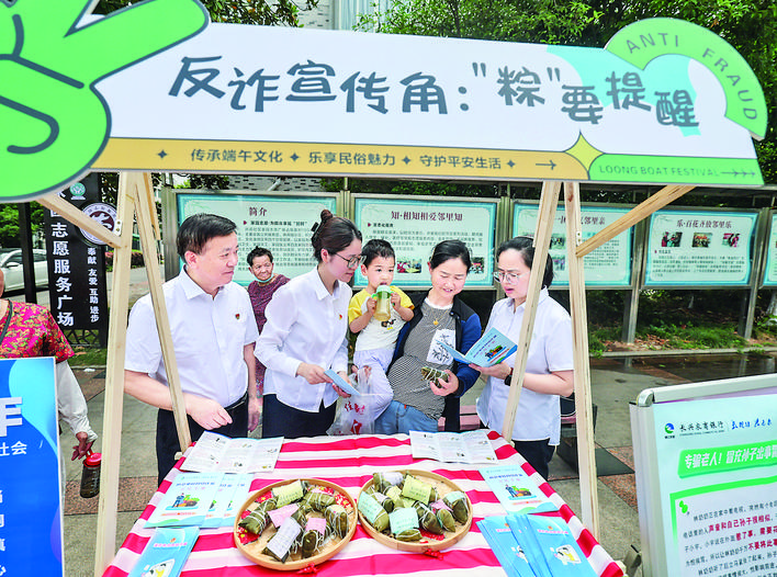 5月22日,湖州市长兴农商银行城东支行工作人员在端午活动现场给居民普及金融反诈知识。 当日,浙江省湖州市长兴县雉城街道所前社区开展“传承端午文化·乐享民俗魅力·守护平安生活”端午主题活动,开展包括传统提线木偶表演、创意手工制作、端午民俗体验、反诈宣传、垃圾分类小游戏等活动,营造端午民俗氛围。 新华社记者 徐 昱 摄