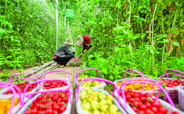 南山采摘园内,工作人员在采摘各种西红柿,准备供应市场。 本报记者 金玉敏 摄