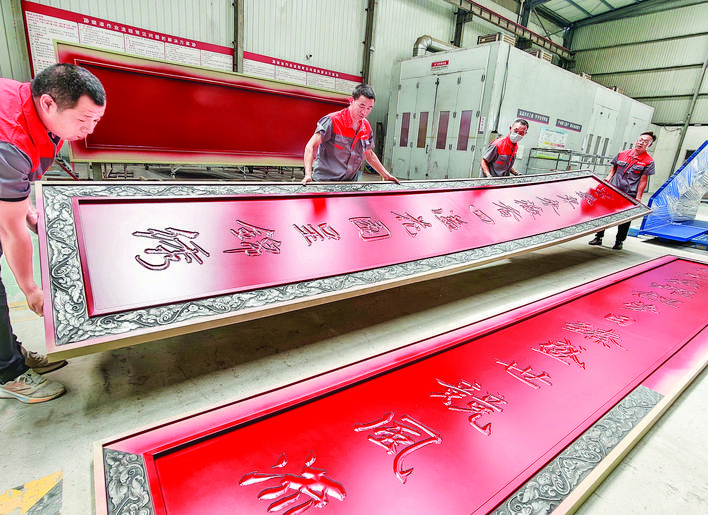 如今,走进世纪品盛,只见在宽敞明亮的厂房内激光切割机、雕刻机、刨槽折弯机等先进设备有序运转,设计、输出、雕刻、焊接、打磨、喷涂等工序有条不紊地推进。在焊接工序,两名工人将高十余米的一副楹联搬到地面,并在边缘粘贴装饰花纹。