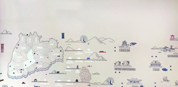 这面看似朴素的浅米色墙面上,一幅运城区域地图宛如历史长卷般徐徐铺展,全市13个县(市、区)的102处国保单位标识,在其上若隐若现、微光闪烁。地图之上,连绵起伏的山峦以简约线条勾勒,古建筑的塔楼与庙宇飞檐翘角翩然欲飞,尽显古朴典雅之美,蒲津渡铁牛等标志性元素巧妙融入其中,无声讲述往昔岁月的沧桑与辉煌。