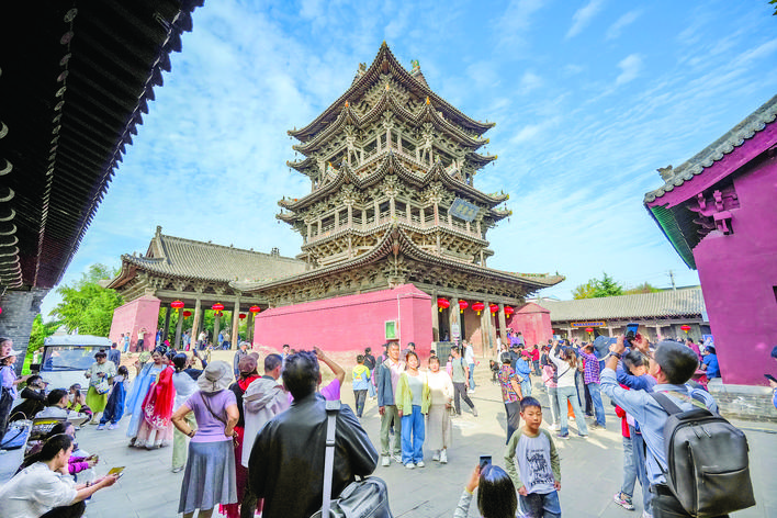 游客在参观纯木质楼阁建筑飞云楼