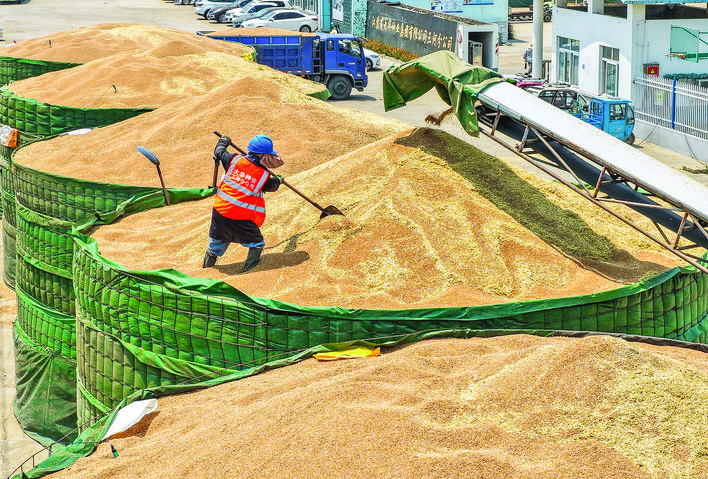 三河农场收获的小麦进入大华种业三河分公司存储(5月28日摄)。 “三夏”时节,在位于江苏盱眙的江苏农垦三河农场的农田里,农机来回穿梭,一片繁忙景象。农人们抢抓农时,进行夏收、夏种等作业。据介绍,三河农场4.1万亩小麦目前已收获七成。 新华社发(许昌银 摄)