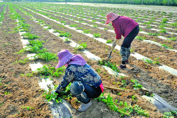 ▲5月30日,在万荣县南张乡薛里村三白瓜种植基地内,瓜农正在为三白瓜苗整枝、压蔓、施肥、除草。 近年来,南张乡大力发展三白瓜特色产业,通过科学种植管理,不断提升三白瓜的品质和产量,助力村民增产增收。特约摄影 张怀心 摄
