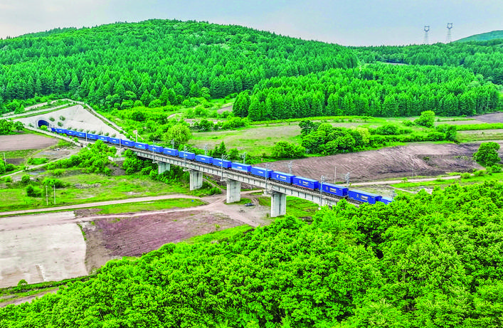 6月2日,一回程中欧班列从中国铁路哈尔滨局集团有限公司绥芬河站驶向山东方向(无人机照片)。 记者从中国铁路哈尔滨局集团有限公司了解到,今年前5个月,经中欧班列“东通道”通行班列突破2000列,通行量占全国总量26.3%,其中回程班列通行量占全国回程总量31.9%,为服务高质量共建“一带一路”注入更多动能。 中欧班列“东通道”由满洲里、绥芬河、同江铁路口岸组成,截至目前,通行线路已达27条,可通达波兰、德国、荷兰等14个国家,联通我国长沙、郑州、成都、苏州等60余个城市,成为中国与“一带一路”沿线国家互联互通互惠的重要载体。 新华社发(曲艺伟 摄)