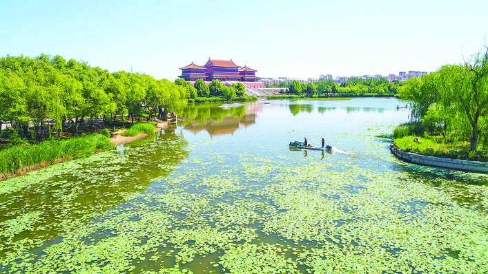 ▲6月4日,志愿者在河北省唐山市丰润区曹雪芹公园打捞水面漂浮物(无人机照片)。 新华社发(朱大勇 摄)