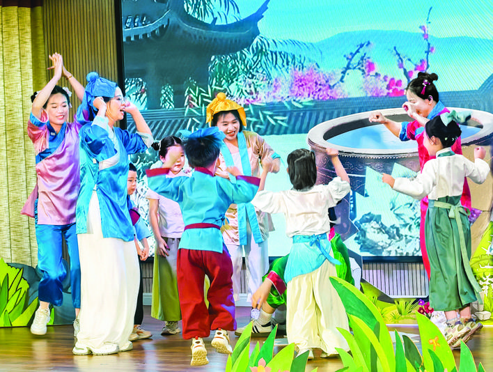 “我们班孩子带来的是‘欢迎来到小人国’情景剧表演,巧妙融合故事讲述、角色扮演与创意服装秀等。我们采用师生共读经典故事、鼓励幼儿自主讲述情节以及促进家庭深度互动参与的方式,引导幼儿在充满趣味的互动过程中,深入理解故事内涵,感悟角色所蕴含的美好品质。”金海湾幼儿园小四班主班教师宋辉霞介绍,“幼儿通过讲述、表演及服装制作等环节,不断丰富语言积累,提升口语表达能力,可以有效衔接小学语文‘在实践中阅读’的素养培养目标。”