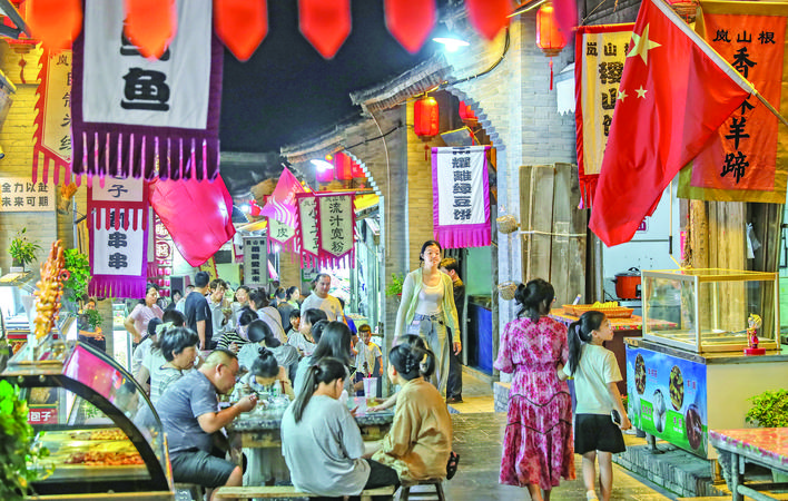 ▼7月12日晚,游客在盐湖区岚山根·运城印象品尝小吃。 岚山根·运城印象为迎接暑期客流高峰,于本月初启动2025岚山根消夏文化旅游节,吸引众多游客在习习凉风下品小吃、看演出。 本报记者 金玉敏 摄